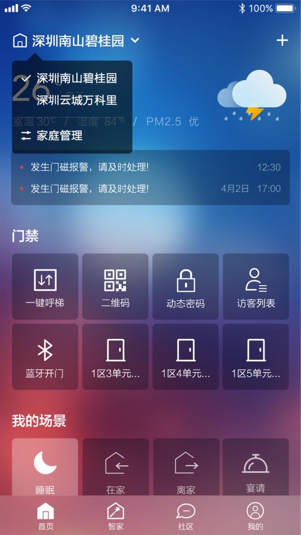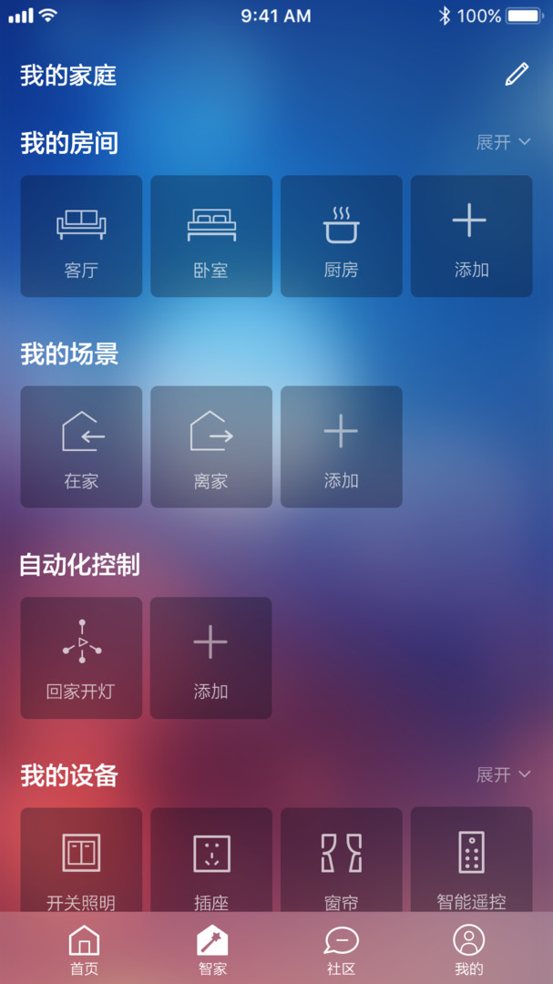 智慧家庭: 远程控制智能家居设备, 自定义家庭场景及自动化,实现设备之间的智能联动, 及家庭燃气,烟雾等各种报警推送通知, 和多家庭管理,成员邀请, 智能音箱等功能;