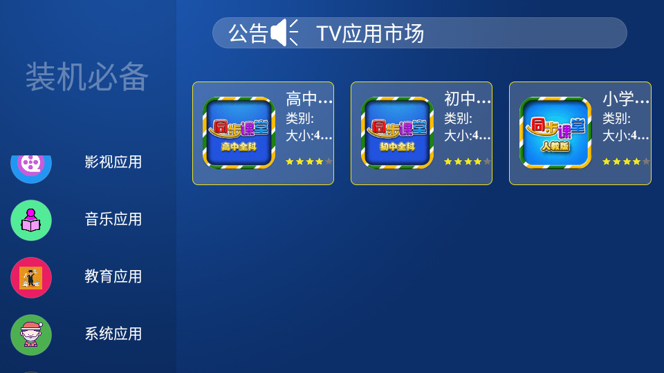 超级市场电视版,这里汇集了海量的热门电视应用资源,包括了影视类、音乐类以及小说类等等类型,每一款应用都有详细的介绍以及截图,适配多种电视机型号,应用更新速度超级快,类型超级全面,旨在为用户提供一个高效、便捷的电视应用管理环境。