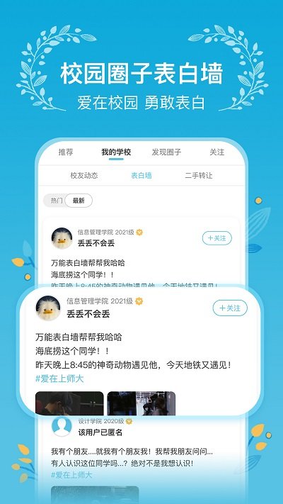 以学校为单位建立校园社区,社区内的内容均是同一所学校的在校大学生所提供。如果你要分享校园趣事,可进入校园动态;如果你想交友,可进入表白墙;如果你是社团,可进入活动板块;如果你有闲置转让,可进入万能墙;