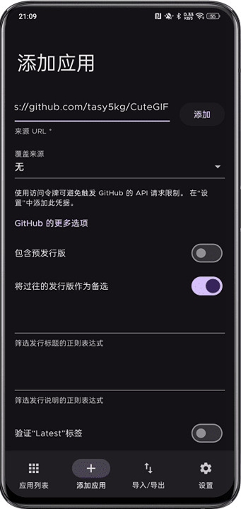 首先切换到“添加应用”页面,在来源URL中输入链接,比如这里输入一个Github链接,然后下方会出现一些特殊选项,按需开启(一般保存默认即可),然后点击“添加”按钮,一个应用就添加完成了。完成添加后,可在应用列表进行查看,下拉列表可以检查更新。有新版本时会在应用名称后显示“下载”按钮,点击即可下载。