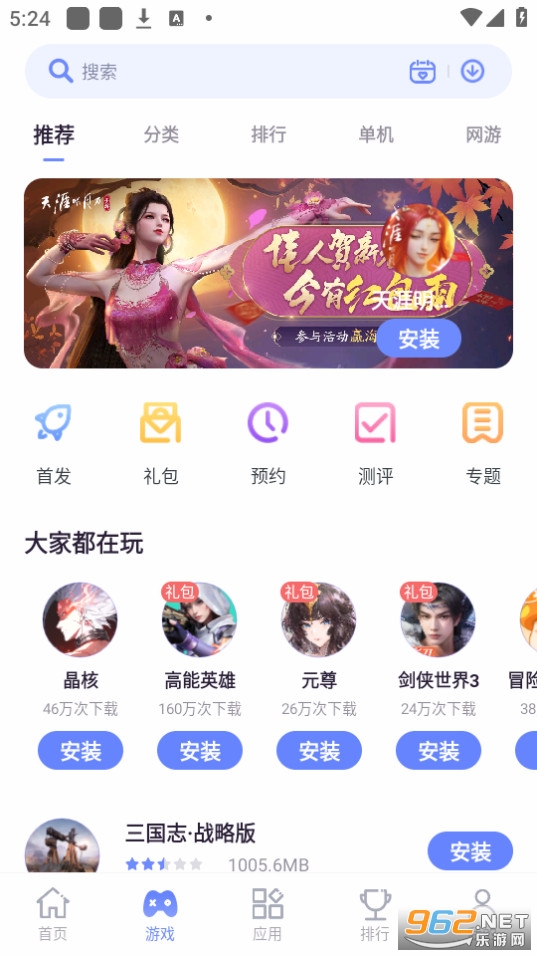 4、点击游戏,即可查看最新最热门的游戏,还可以点击中间的礼包,领取你的专属游戏礼包;