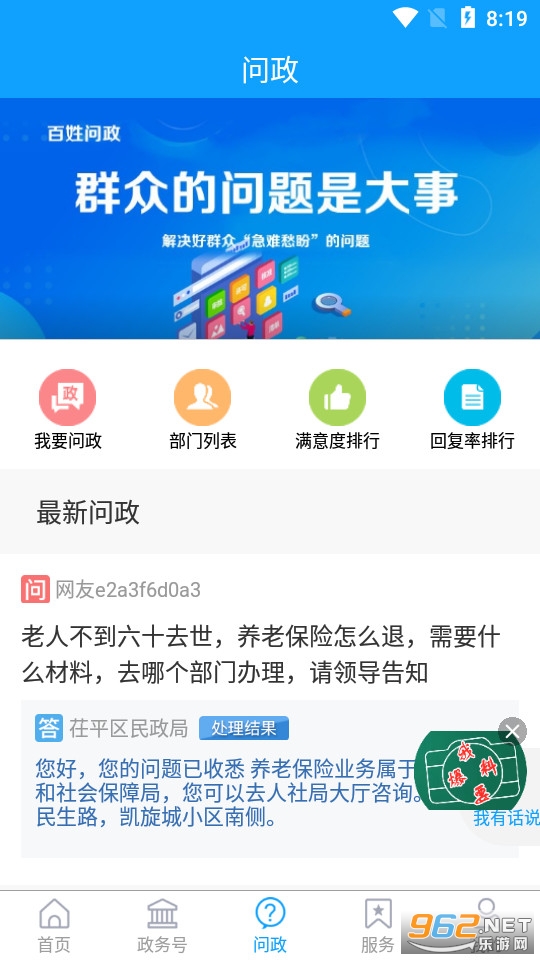 问政和政务号板块,乡镇街道和区直部门全部应邀入驻,接受群众的咨询和投诉,解决了服务群众“最后一公里”的问题;