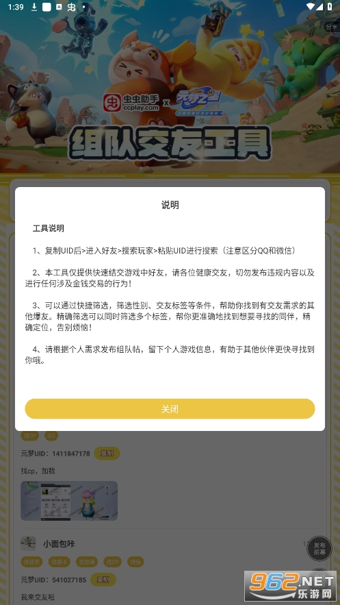 2、本工具仅提供快速结交游戏中好友,清各位健康交友,切勿发布违规内容以及进行任何涉及金钱交易的行为!