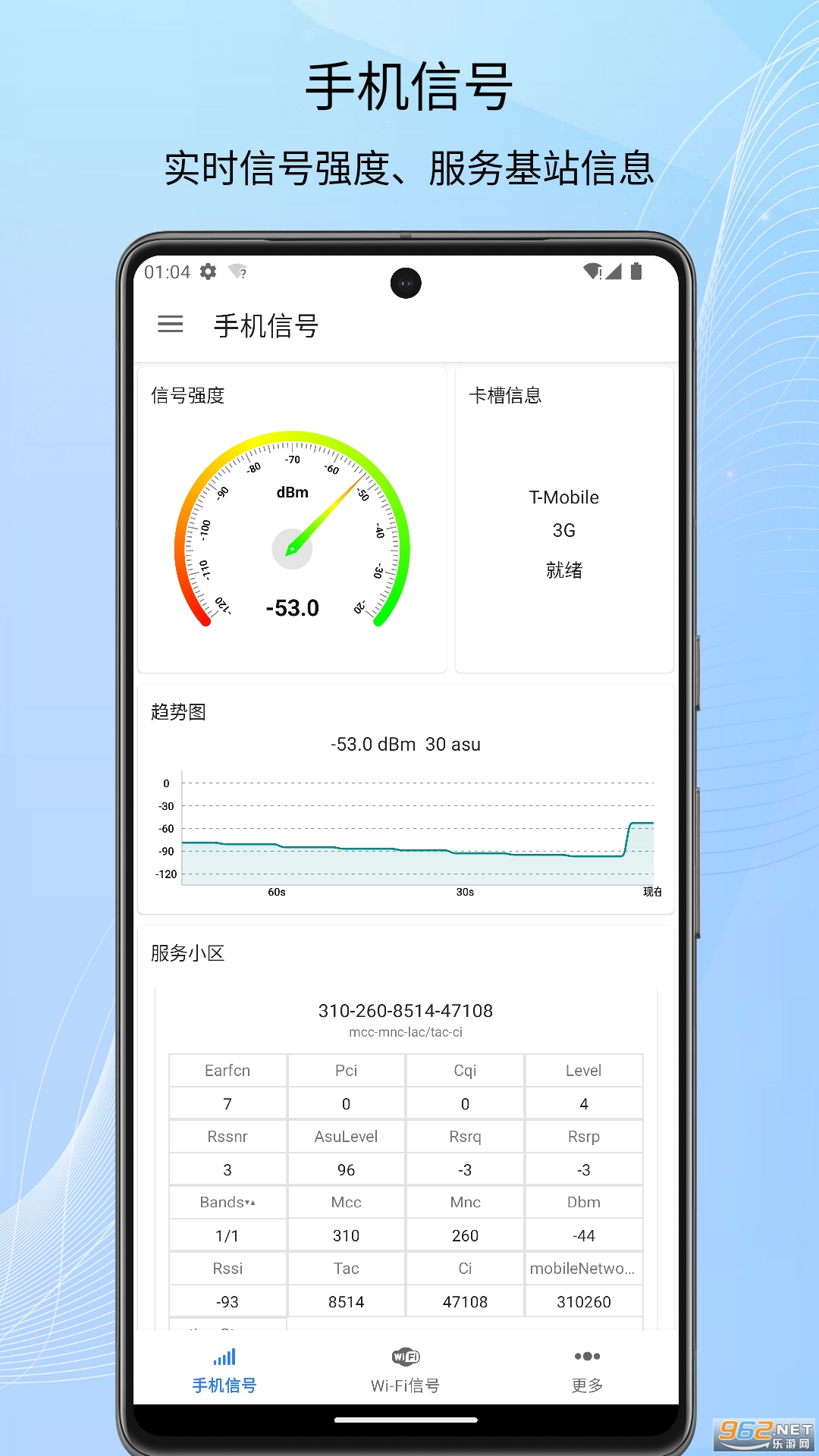1.手机信号:实时检测手机信号强度,查询SIM卡信息、运行商等信息,获取基站位置信息,查询服务小区信息,获取小区信号强度、lac/tac/ci等小区信息,浏览附近小区信息等信号检测服务;