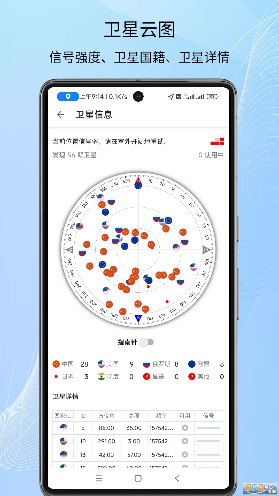 3.GPS信号:实时检测GPS信号信息,获取卫星信息,包含国籍名称(美国GPS、中国北斗、欧盟伽利略、俄罗斯格洛纳斯、日本准天顶卫星系统、印度IRNSS)、卫星数量、卫星实时位置、是否可用、经纬度、地址等信息;