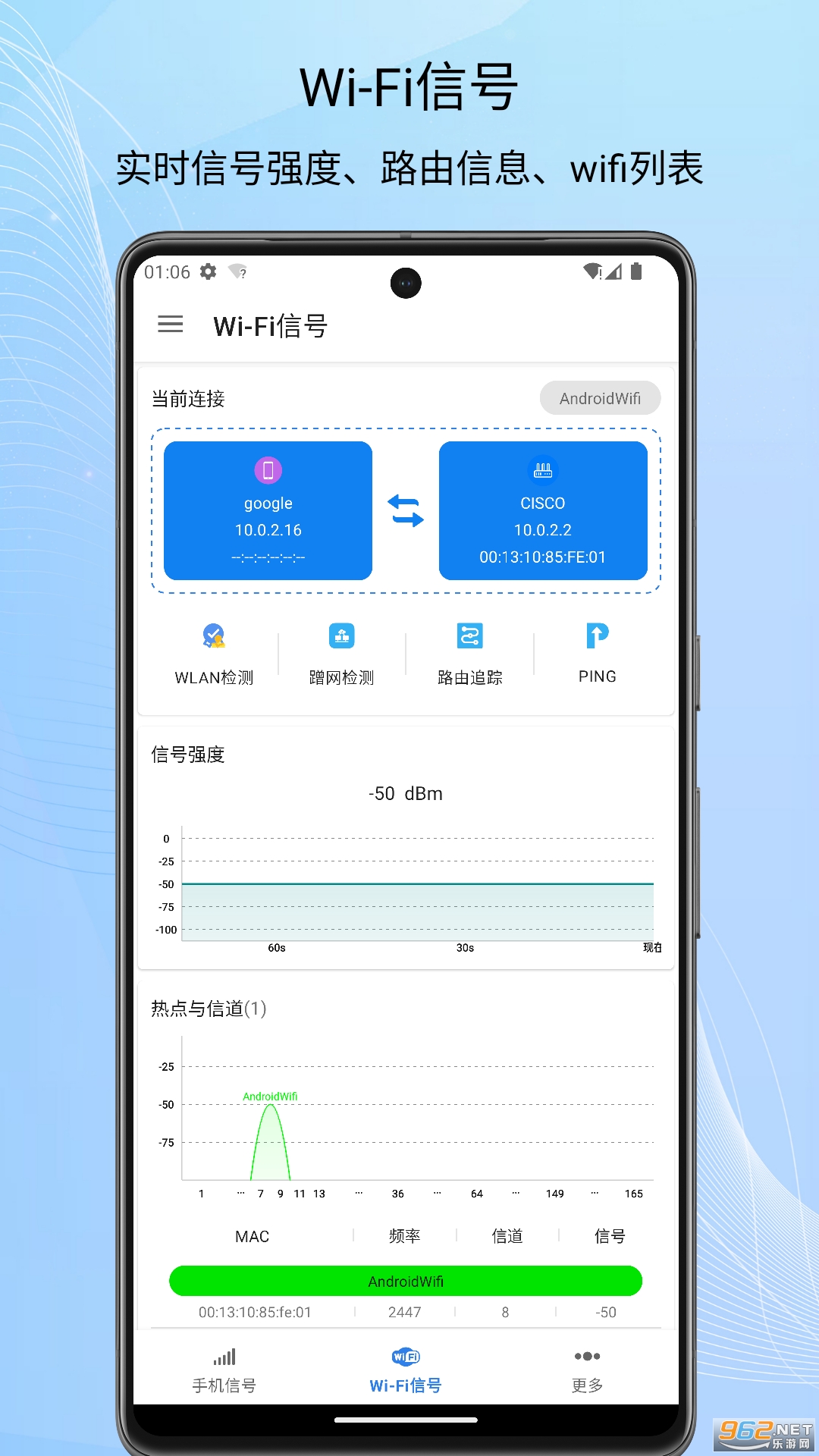 2.WIFI信号:实时检测WIFI信号强度,查询WIFI信息,如信号强度、mac地址、信道、IP配置、连接速率等相关信息,并获取wifi信号与信道等信息,wifi安全性检测,wifi下连接设备信息;