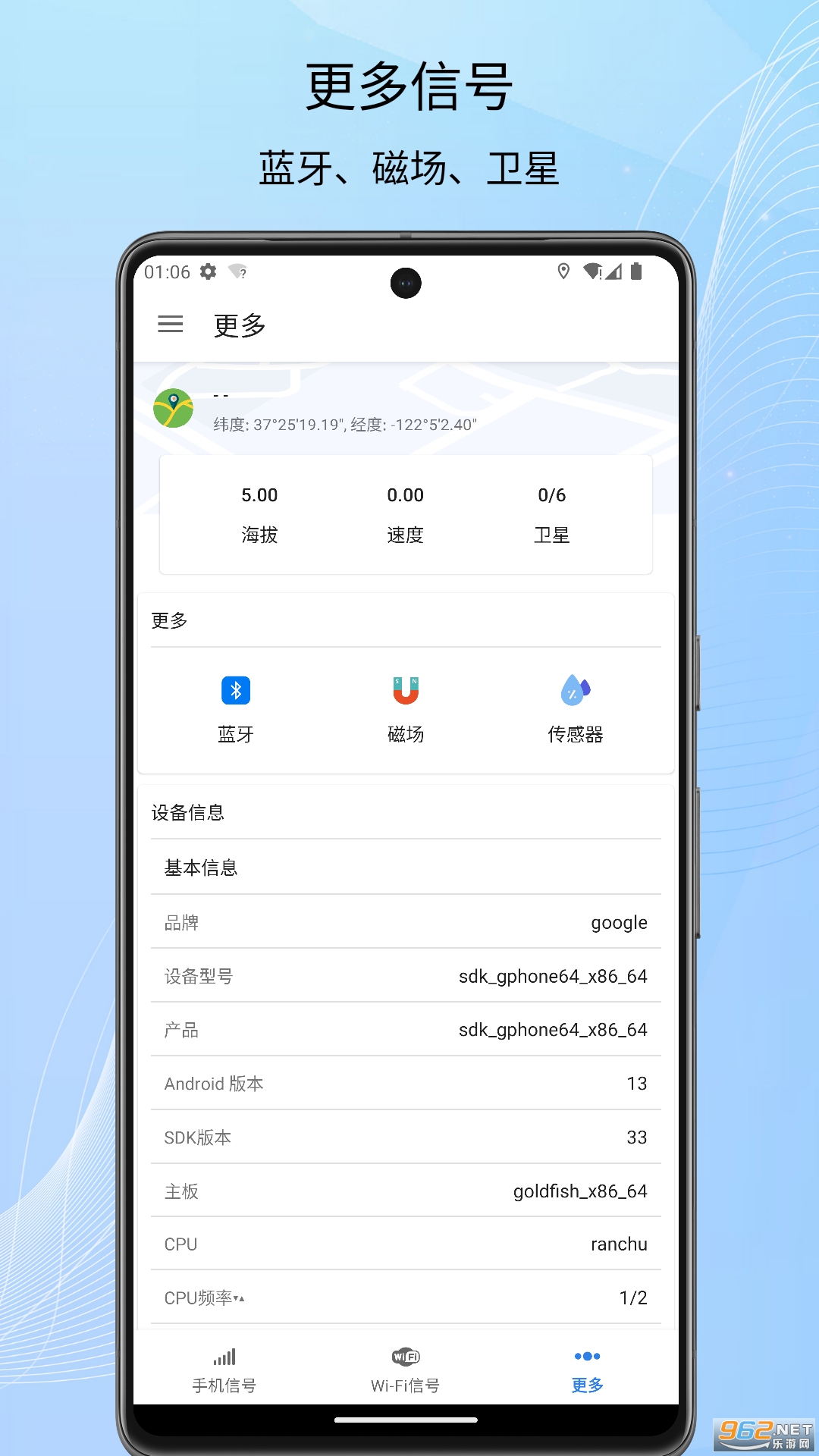 信号检测仪app是一款实时监测信号的软件,专业化的监测工具使用操作起来更加轻松,不管是wifi、卫星云图还是海拔等都能实时检测的到,操作简单使用便捷,有需要的快来下载吧!