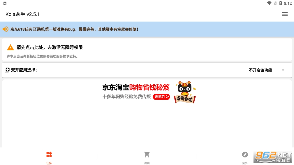 《Kola助手》即《cola任务助手》,是一款超级好用的双十一手机辅助工具。能够帮助用户在双十一来临之际,自动浏览各个平台的任务,自动做任务,领优惠券,不需要你亲自动手,完全解放双手,使用之前先开启无障碍辅助与悬浮窗,有需要的话就来下载吧!