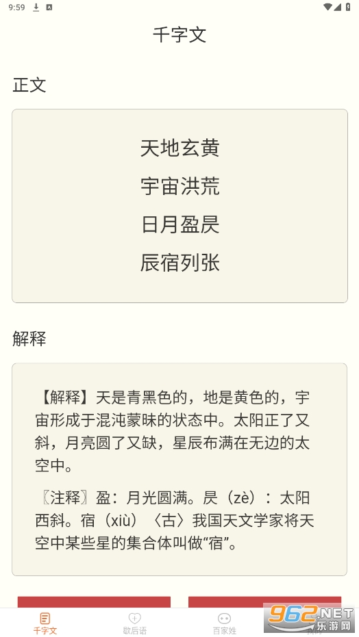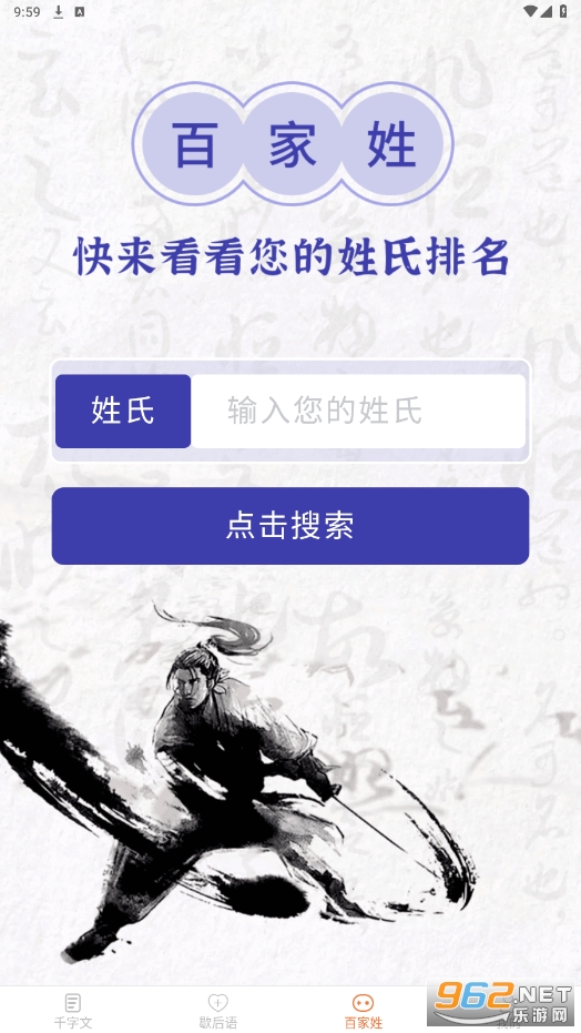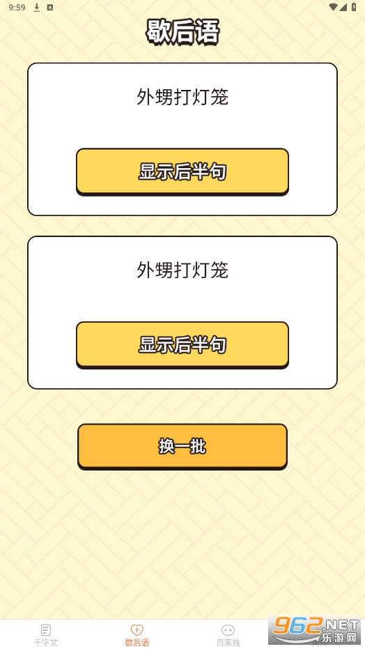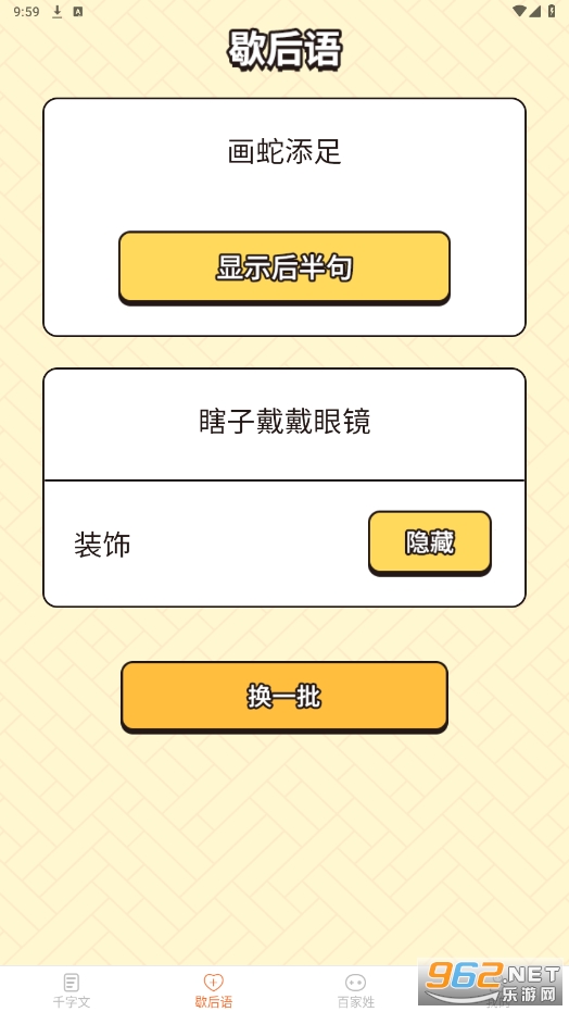 界面简单、直观,容易上手,其中歇后语和百家姓部分分别提供了几百条常见的经典内容。