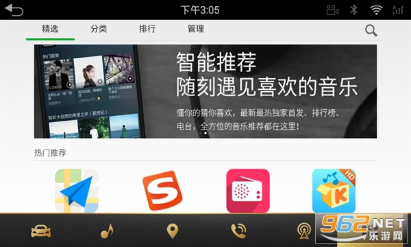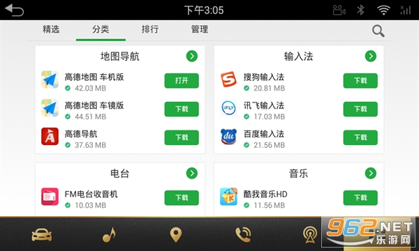 3、分类:将所有适合车机使用的应用按照地图导航、代驾、养车、违章查询等类别进行分类,让您一目了然找到目标应用。