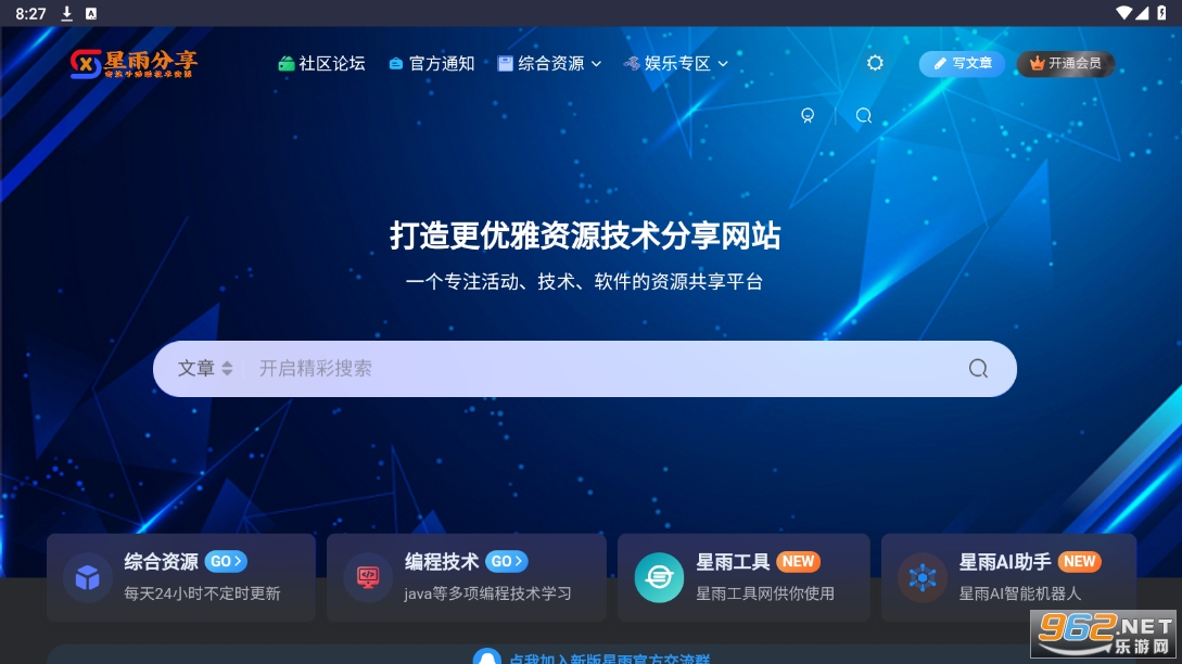 星雨社区app是一个特别特别非常好的手机资源分享软件平台。星雨社区的页面简洁,操作简单,星雨社区资源分享app不仅提供了技术博客、代码片段、开源项目等资源分享功能,星雨社区软件还包括了各种技术问答、招聘广告等板块。该软件的功能非常完备,可以进行资源搜索和下载,用户可以在其中找到各种相关的技术资源。