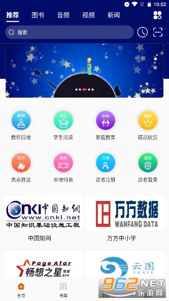 4.点击APP首页进入阅读学习,可选择教师园地、学生阅读、家庭教育等栏目,亦可点击万方中小学数据库、云图有声听书、超星资源学习阅读