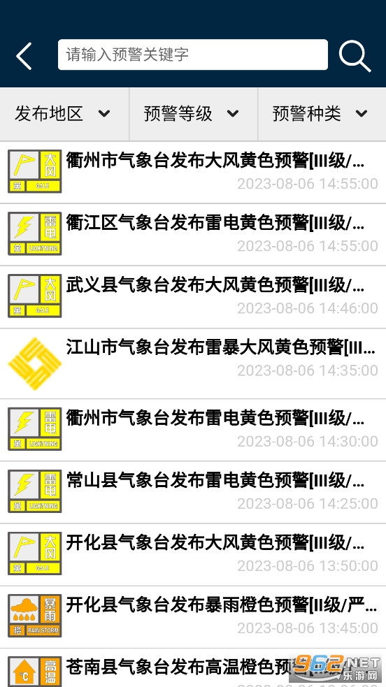 《浙江预警发布app》是浙江省预警信息发布中心推出的一款突发事件预警信息发布软件,朋友们可以在浙江预警发布app中查看最近发布的各种各样的预警信息,比如高温、大风、雷电、暴雨等等,各种突发事件及时发布,让民众提前做好预防准备。