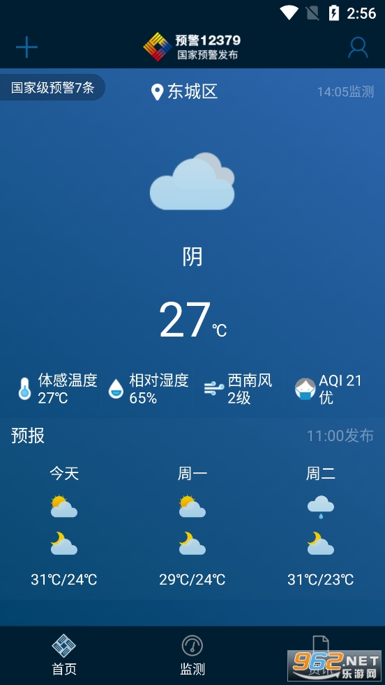 启动程序,自动寻找到您当前所在的位置(城市),并在主页中清晰显示当前的温度、湿度、风况、气压、能见度以及未来几天的天气预报。