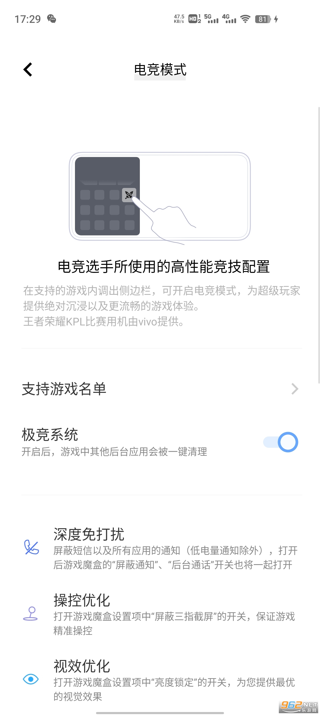 打开之后,系统将会自动提示已开启的优化方案,其中包括vivo多年以来的SDK底层优化、CPU以及内存方面的优化方案,对于游戏的帧率稳定起到了重要的作用。如果在游戏过程中经常受到无关且不重要的信息骚扰时,可以打开后台通话、屏蔽通知或者是直接拒接来电,免去打扰。