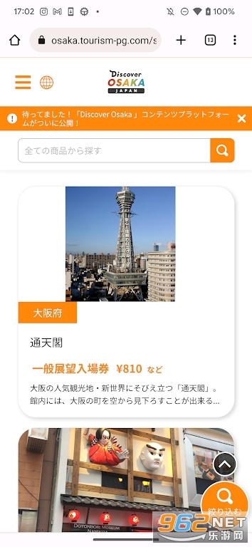 Discover OSAKA APP点开旅游信息页面就可以看到大阪各种各样的景点、活动信息。支持日文的同时,中文、英文、韩文也全部支持哦!点击任意一个你感兴趣的景点,里面就有关于该景点的详细介绍~门票价格、具体地址、注意事项等信息一应俱全,再也不怕看不懂日文啦~