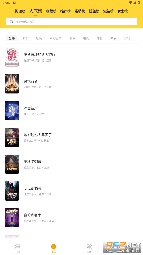 在精选页面,可以切换最上方的榜单选择适合的小说类型,或者是在下方还可以拖动切换类型