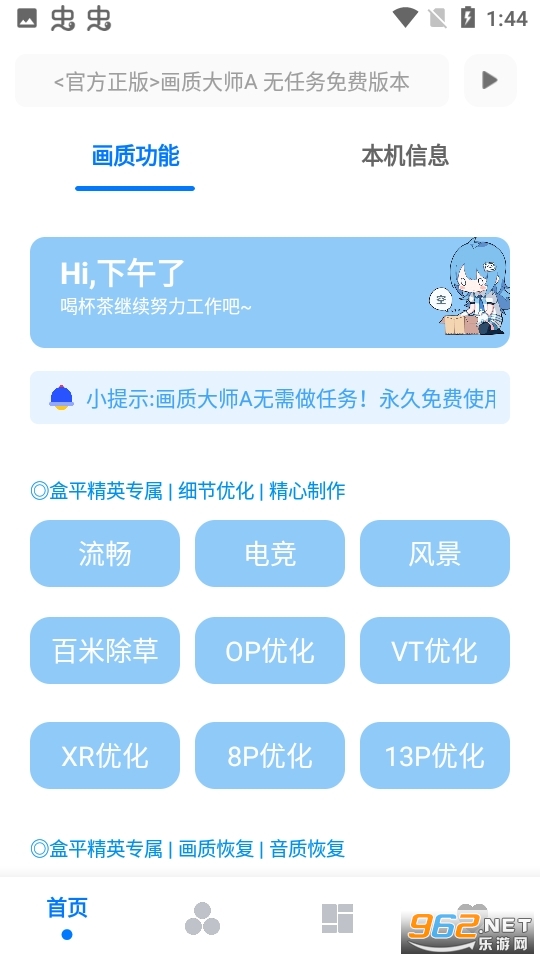画质大师A专为吃鸡游戏打造,该辅助工具安全无毒,免费使用,适配于各型号的安卓手机,操作起来简单方便,一键就能更改画质,提升游戏画面分辨率,自定义为设备改善最佳画质。