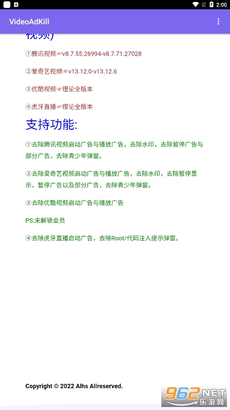 2.此软件是专门针对四大视频平台打造的纯净去广告模块。