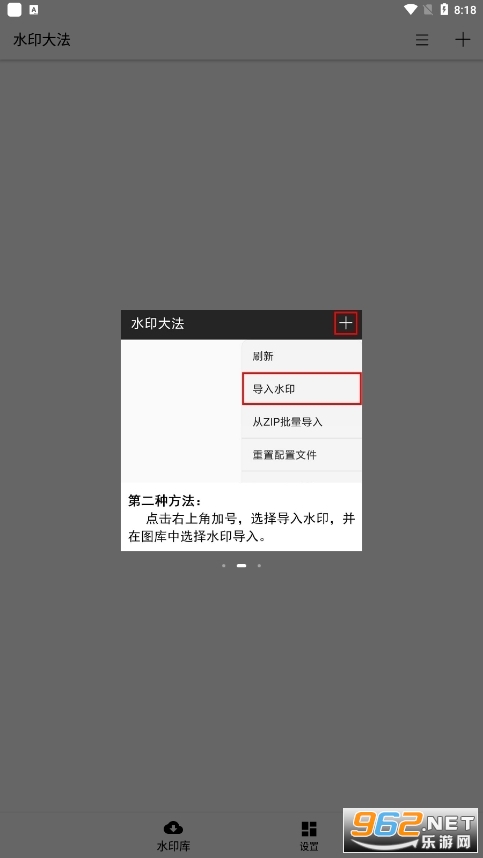 自定义水印功能只需要把水印图片放入对应的目录(目录可以在设置界面设置)即可使用,也可以从右上角菜单进行导入。