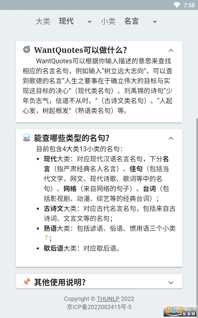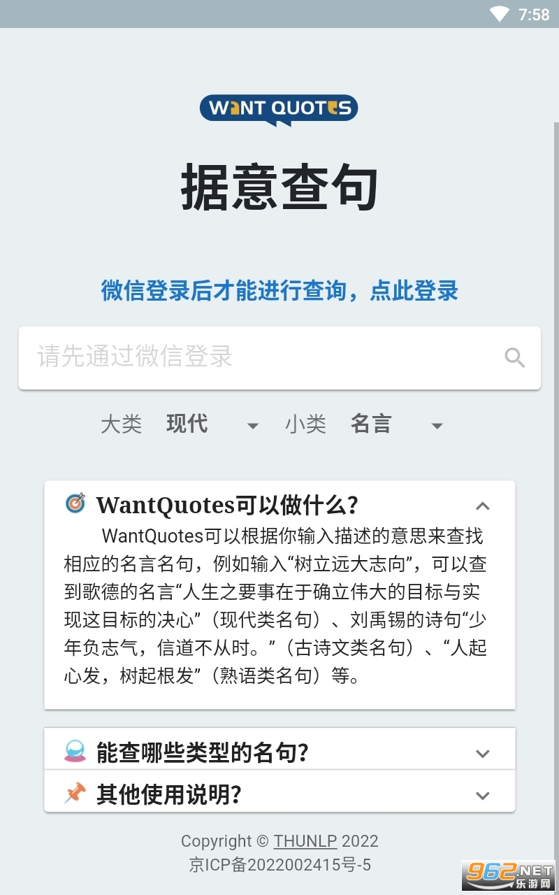 《据意查句反向词典》是一款好用的名句搜索软件,很多时候想要表达你的想法但是却没办法合理的表现,你可以进行描述来寻找贴近意思的名言,包括了国内外各种不同的说法,软件的功能非常实用,快来试试吧!