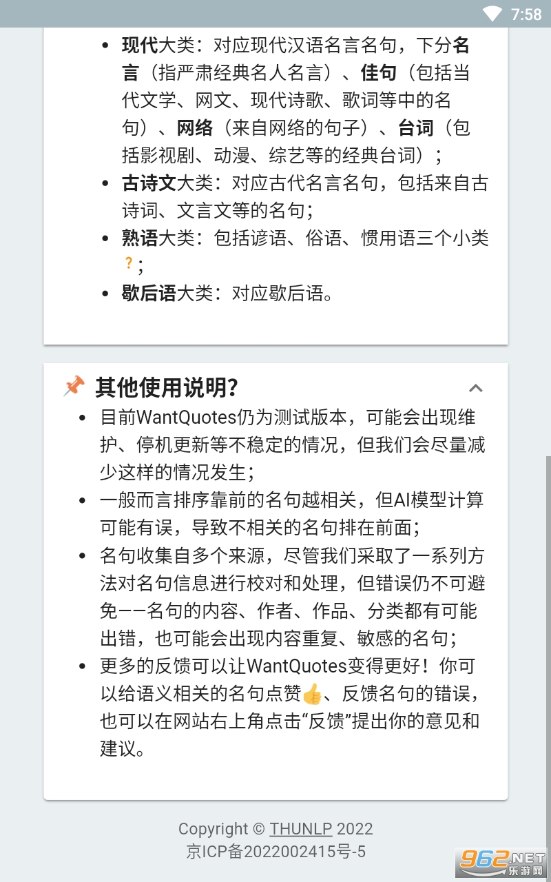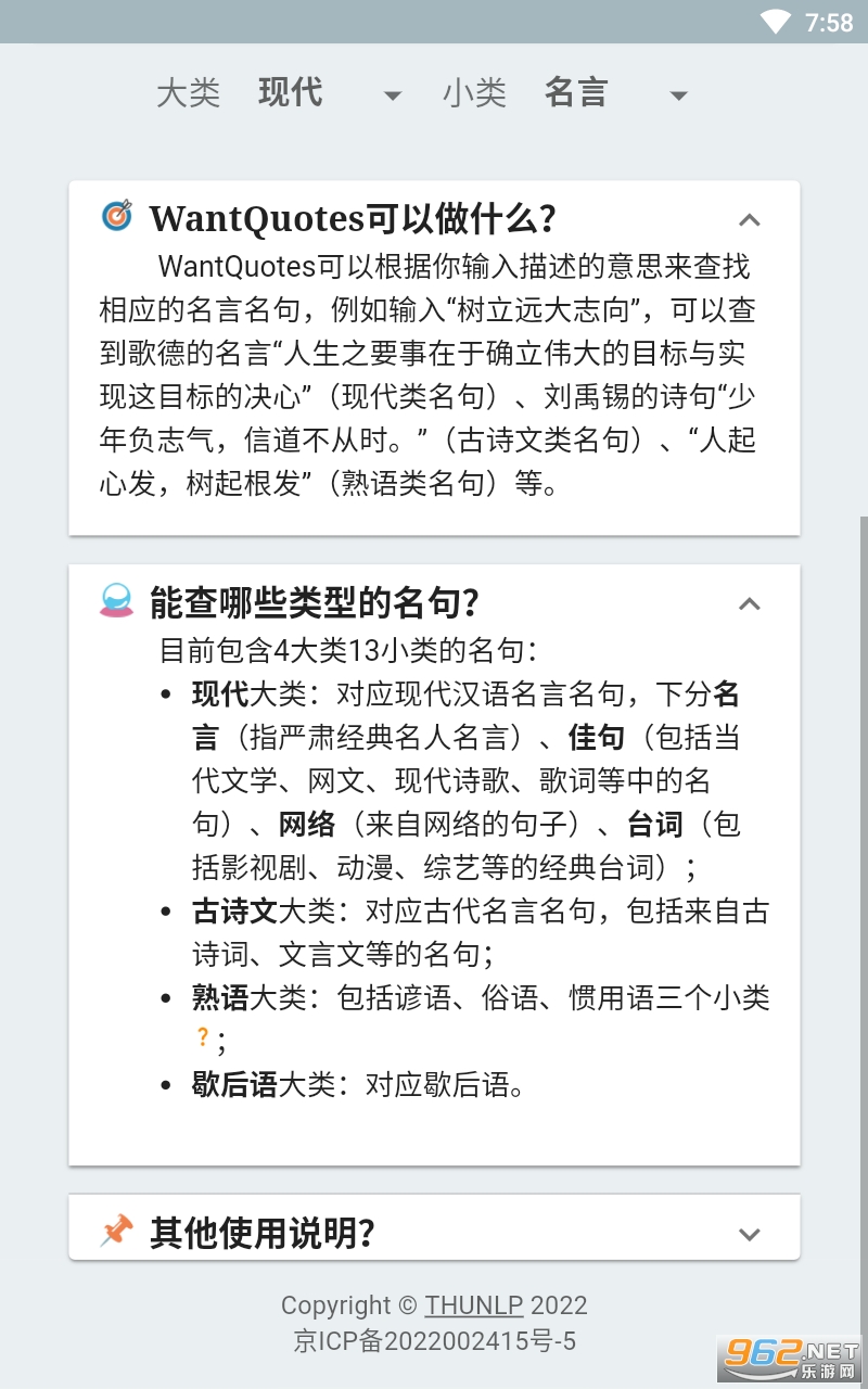 《wantquotes据意查句》是一款用起来非常不错的反向词典的工具,用起来的方法也还是很不错的,当然操作的方式很简单,可以通过查找意思去查询出对应的单词,属于反向查询的方式,感兴趣的亲们赶紧下载吧。