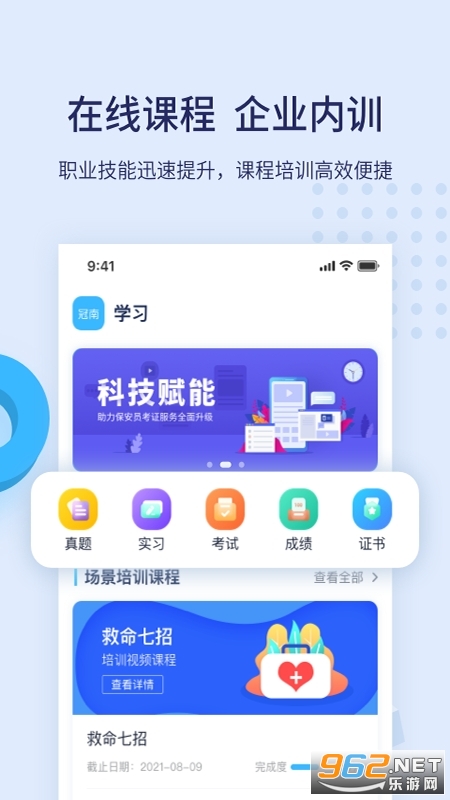 2、在线培训:在线高品质专业培训课程,保安员资格证、等级考试报名、培训、考试整体解决方案,量身打造企业专属学习平台,提升员工能力。