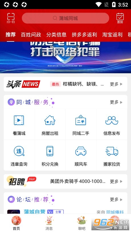 《蒲城同城app》是蒲城县本地城市生活服务软件,能为蒲城县当地市民提供同城热点资讯、重要公告、租房、顺风车、招聘、便民服务等功能,是本地人的生活应用软件,如果你是蒲城人或者生活工作在这里,请下载安装这款软件吧。