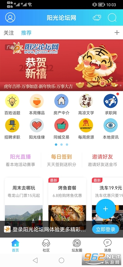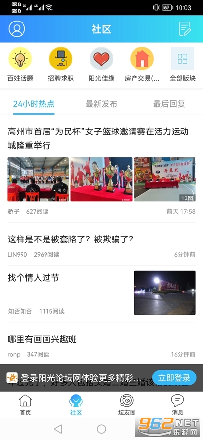 《高州阳光论坛网app》是高州市金威电脑服务有限公司推出的一款高州本地论坛服务平台,是阳光论坛网的手机移动端,有着百姓话题、房产中介、求职、招聘、本地资讯、房屋转让、车交易、本地美食等众多的功能模块,可以和高州本地人一起交流探讨。