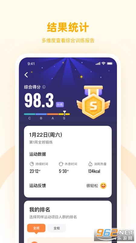 3.运动结果查看。完成运动后,可以查看包括运动时间、消耗热量、智能测分等多维度的锻炼报告,还能查看和全班全校同学的锻炼对比以及每个动作的表现详情。