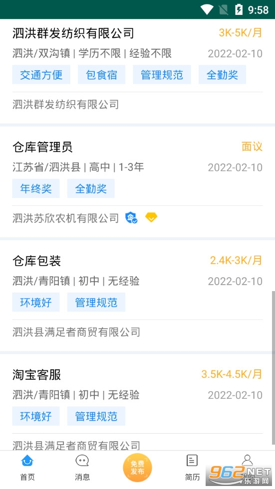 适合到泗洪找工作的朋友,可以在平台查看泗洪地区的各种招聘信息,可以寻找各个岗位去投递简历,当然公司企业也可以在平台去寻找自己需要的人才,有需要的朋友可以下载试试。