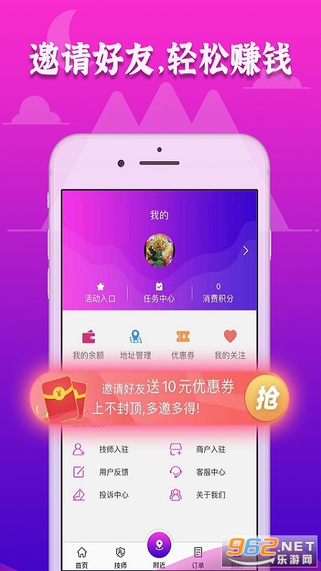 2、附近技师:根据地图和定位,快读找到距离近、上门快的技师,有地图模式展示和列表模式展示。