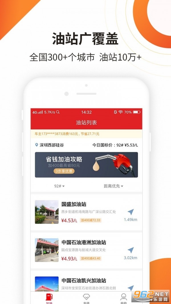 【范围广】覆盖国内32个省9万余家站点,站站有优惠,智能站点导航,附近油站一目了然。