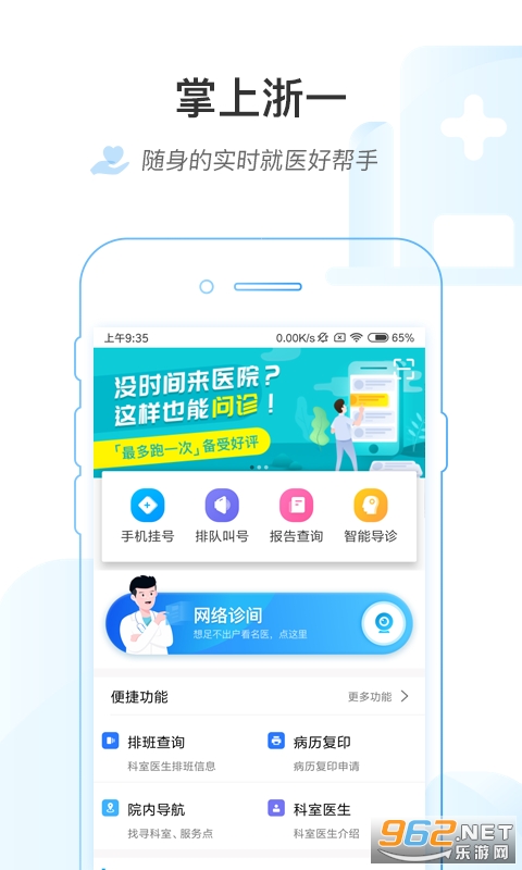 《掌上浙一》是浙江大学医学院附属第一医院为了缓解问诊就医压力的手机端应用软件,打造新型客户端互联网医院,一网互通将互联网信息技术应用到医疗服务上来,用户们可以借助这个平台随时挂号预约,选择自己的空闲时间以及医生,随时前往医院问诊就医。