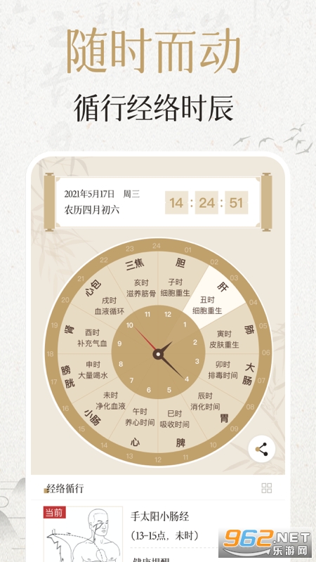 6、【经络时辰】:时辰结合经脉循行,以360度3D动图的方式展现循行线路,并根据时辰提供养生建议。