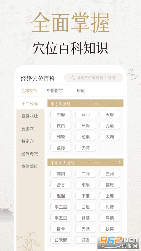 3、【经络穴位百科】:覆盖十二经络、奇经八脉、五腧穴和经外奇穴、全身425个穴位及中医基础,包含病症主治、艾灸、推拿、拔火罐、保养,针灸等丰富内容。
