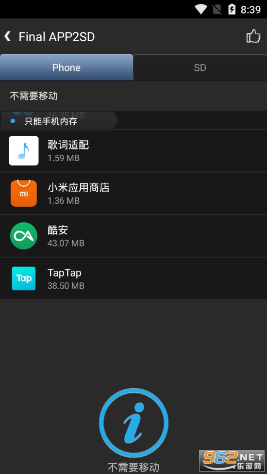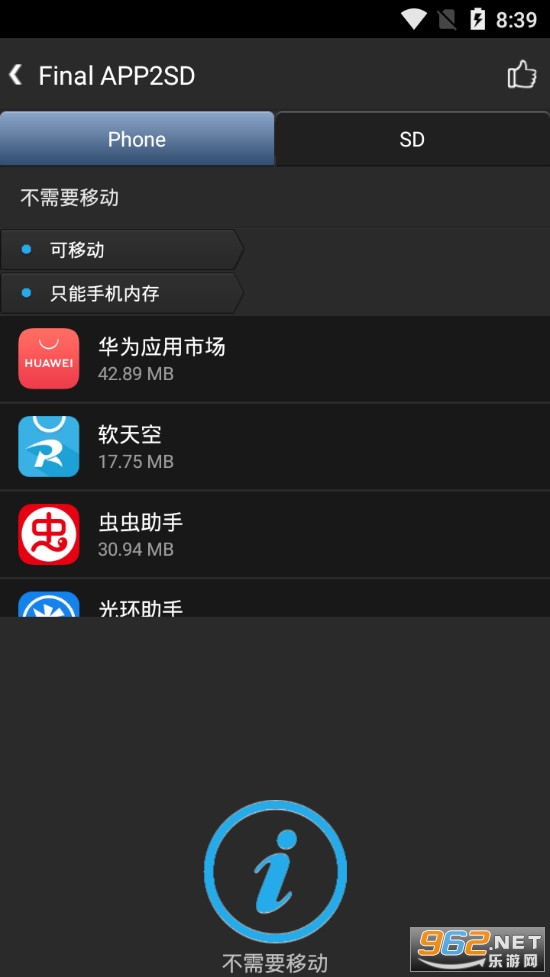可以用来将手机内存中的应用搬到手机的SD卡中,节省手机内存,提高流畅度,软件操作简单,进入软件后可以看到可以移动的应用,点击移动后确定即可,有需要的朋友可以下载试试。