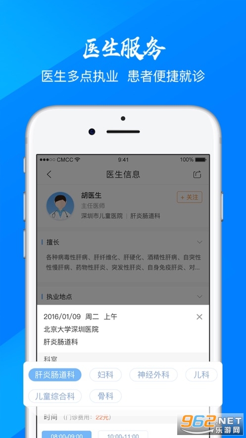 一键挂号:国家卫计委官方认证平台,无虚假医疗信息,挂号不再请假排队,覆盖全国六省七市三甲医院,汇集海量外科、内科、儿科、妇产科、骨科、中医等常见科室及疑难杂症热门专家号源,足不出户7×24小时随时预约。