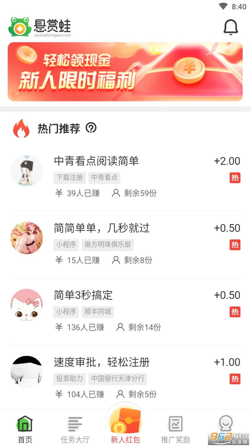 1、悬赏蛙轻松领现金,新人限时福利完成任务领奖励,累计获得40次任务奖励次数和累计提现100元后,共计可领取12元的新人奖励