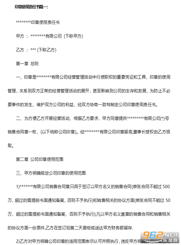 1)*有限公司销售合同章只用于签订以甲方名义的销售合同(单张合同不能过500万,超过的需提前书面通知备案,否则不予执行)和销售相关的协议方面(单张合同不能过50万,超过的需提前书面通知备案,否则不予执行);凡以甲方名义盖章的销售合同和销售相关的协议方面一份原件,乙方在签订后第二天寄给或送达甲方财务部留存.