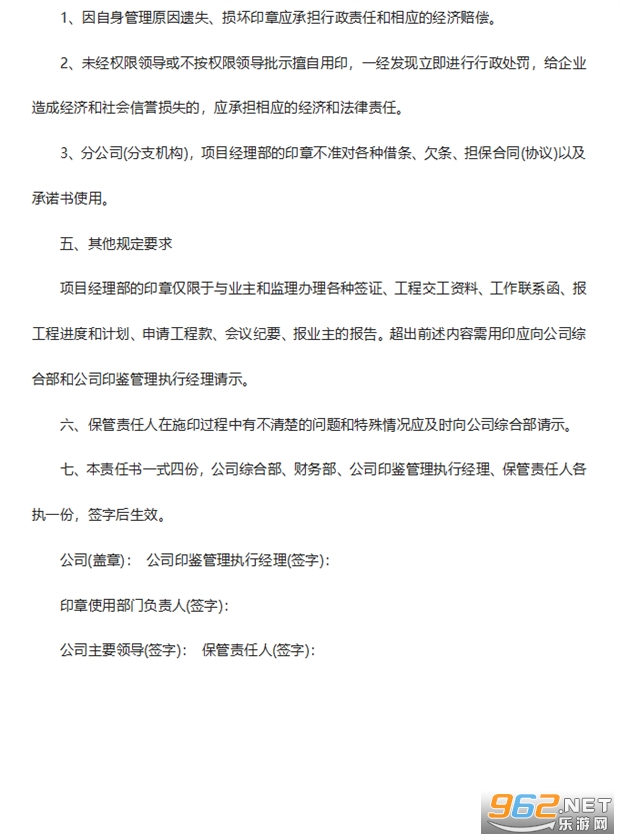 七、本责任书一式四份,公司综合部、财务部、公司印鉴管理执行经理、保管责任人各执一份,签字后生效。