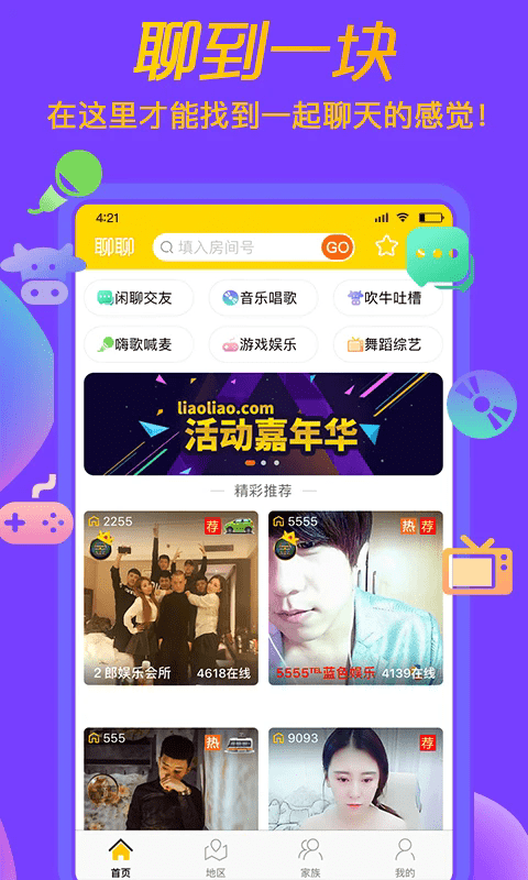 3、首页提供闲聊交友、日常吐槽、音乐欢唱、激情喊麦与趣味游戏互动。