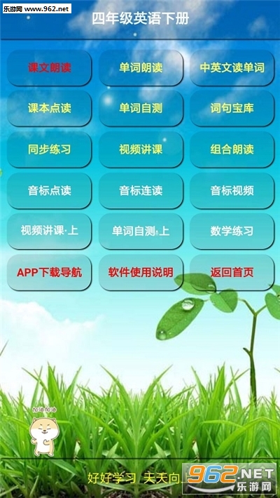 1、小学英语四年级下册所有课文、单词的翻译、朗读。(单词朗读有二种模式:纯英文读、中文-英文,方便记忆)