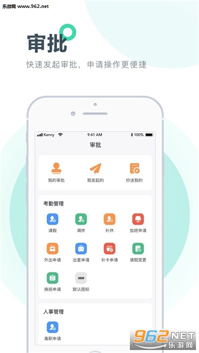 2、移动式申请审批管理,通过手机即可办理请假,外出等申请,审批在线一体化流程,跟传统审批步骤说再见。