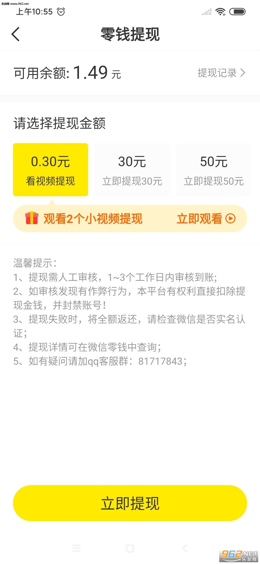 6.提现:永久满0.3元提,需要观看小视频才可提,秒到