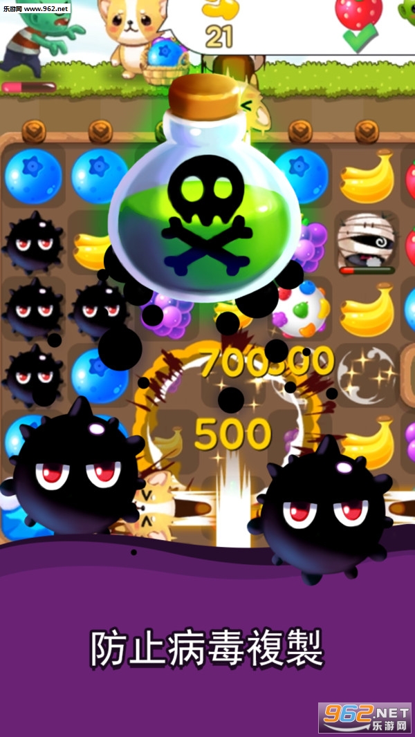 1、开局的时候病毒会随机出现在阵中的任何一个地方,先消除周围的水果放置它们被感染。