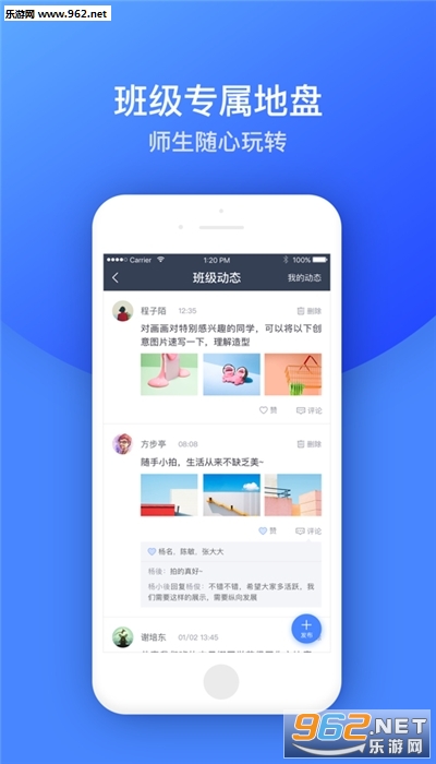 2.班级圈:同一个班级的师生可一键发布图文并茂的动态交流生活感悟,分享有趣知识;老师可以发送班级或作业通知,同时该班级相关的师生可查看班主任运营管理的文化墙:相册,班训等。