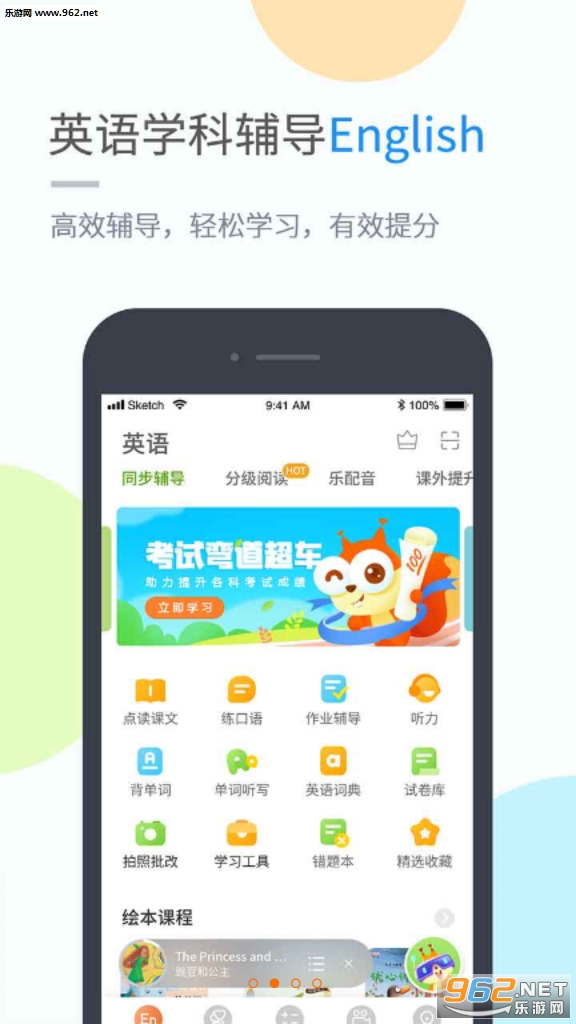 课本点读、练口语、作业辅导、绘本课程、考试测评、早读课程、课前预习、课后巩固、阅读训练、语法训练、听力训练、每日英语、老师作业、丢分题、精选收藏、听力、欧美课程、学习工具、乐配音、乐配音测评、词典、单词听写
