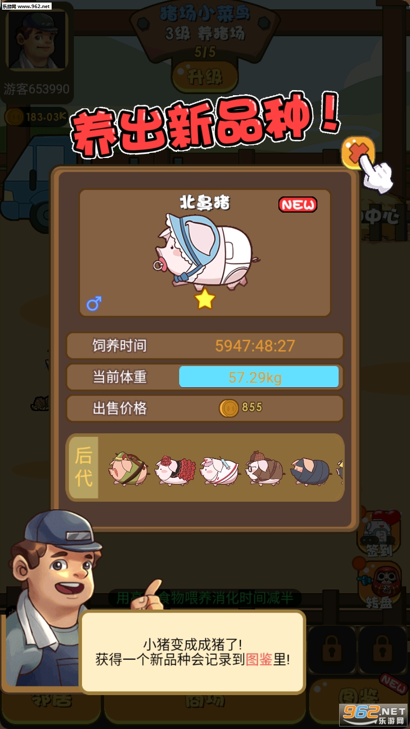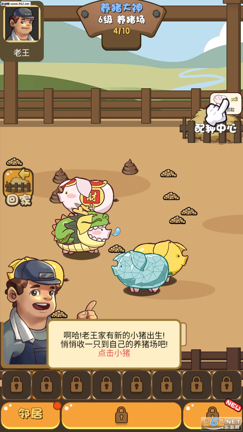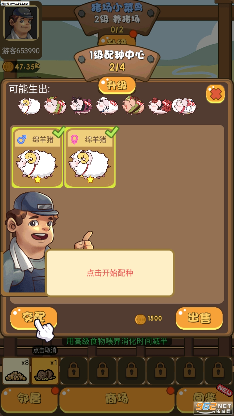 1、每天上线进行签到就能领取各种猪饲料,不同等级的猪进行养成交配繁殖;