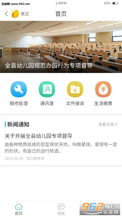 快捷功能包括报修处理、通讯录、文件接收;